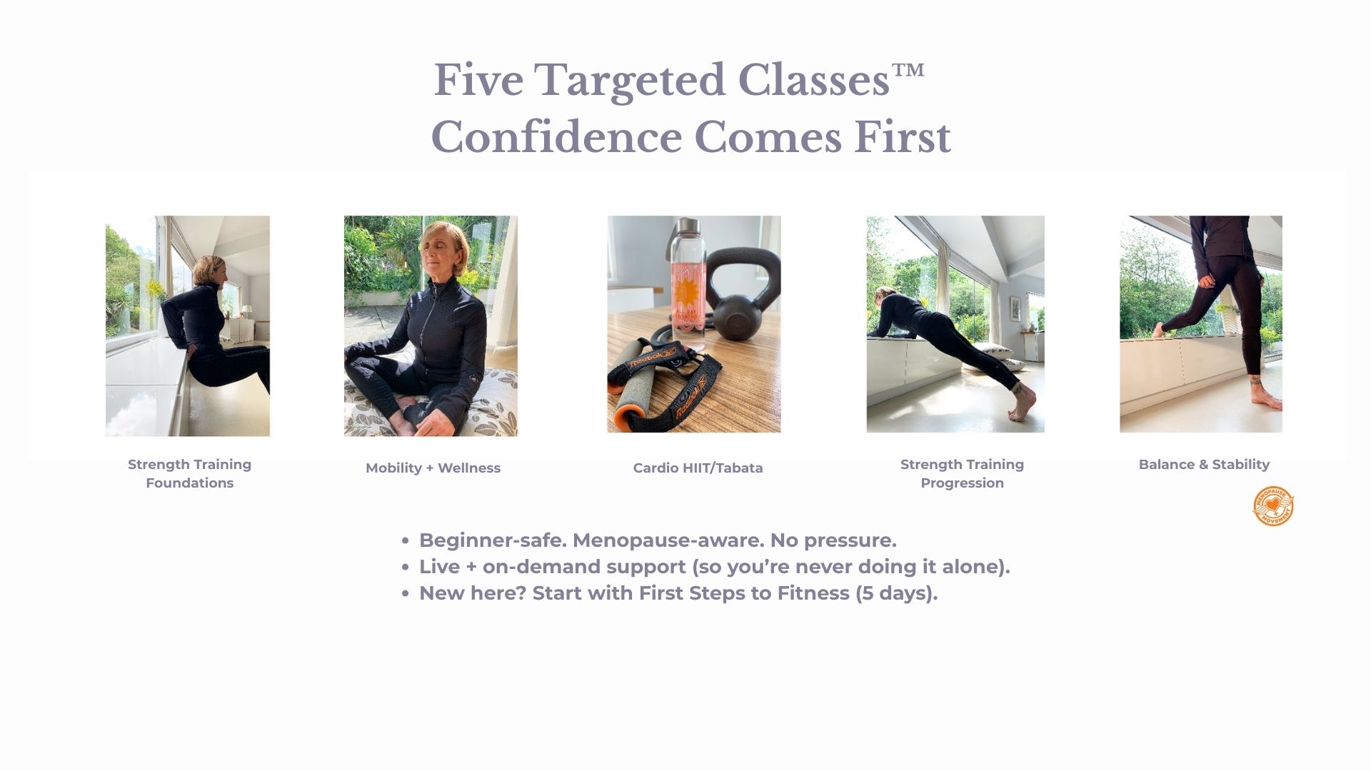 Strength • Mobility • Cardio/HIIT • Balance & Stability • Wellbeing