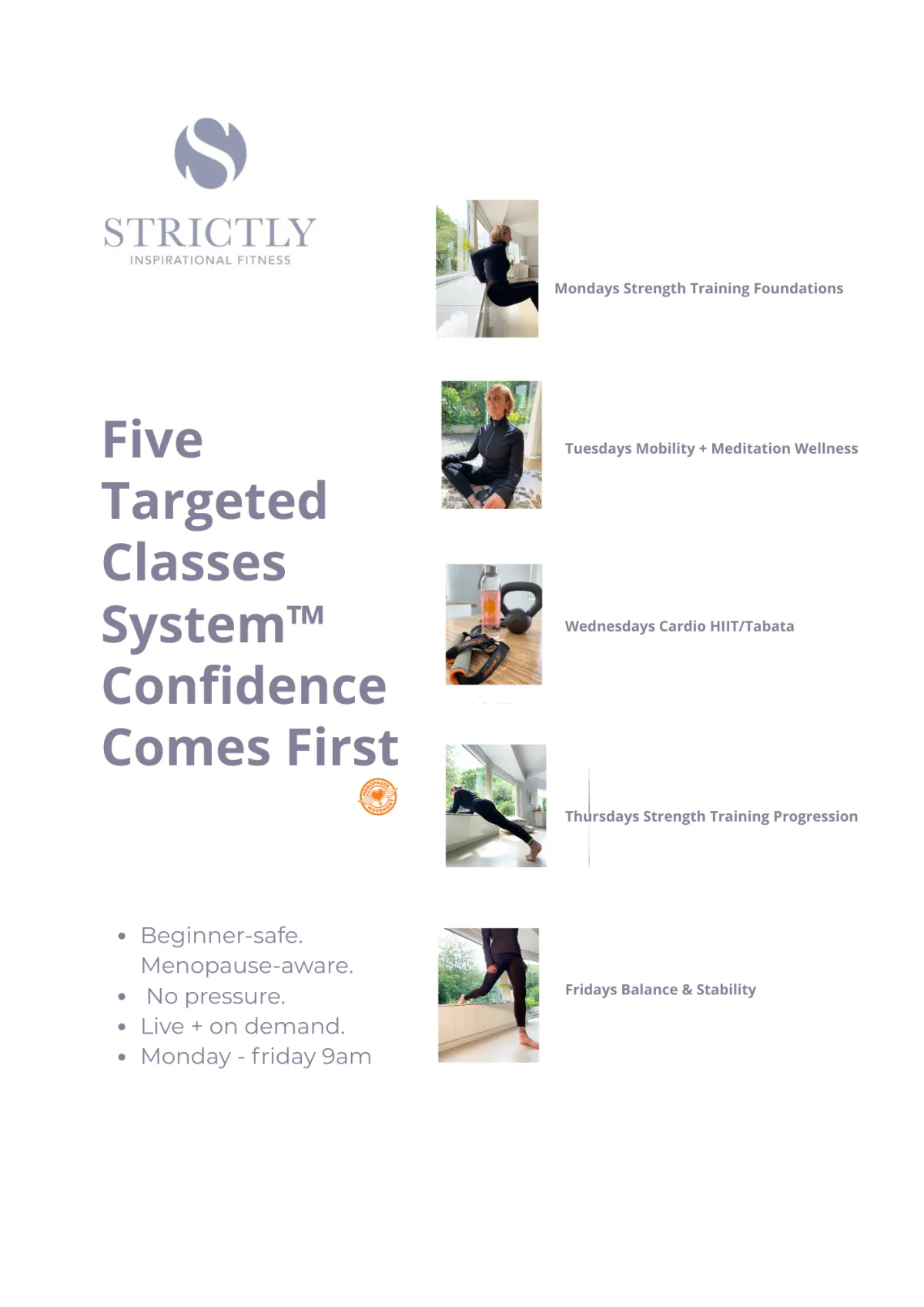 With nearly four decades of coaching women — combined with my own menopause experience and the lived experience of my clients — I created the Five Targeted Classes™ System.